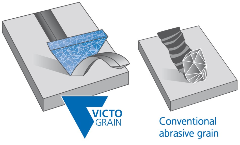 The structure of the triangular VICTOGRAIN has also been specially adapted to maximize results. The very small crystals inside the triangles ensure optimal wear characteristics as sharp cutting edges are always exposed, but only the minimum amount of abrasive grain/the triangle breaks off.