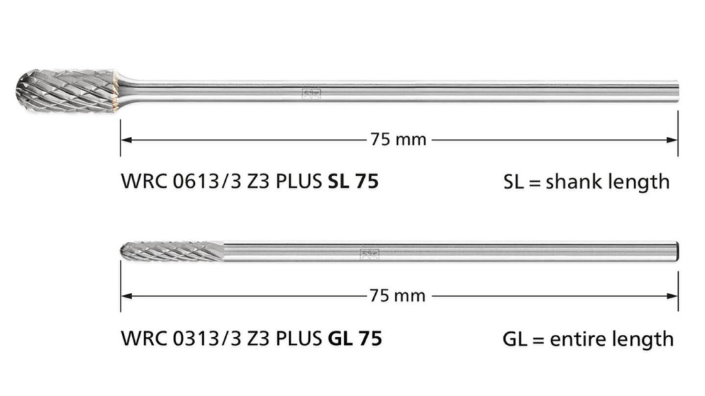 GL refers to the entire length of a solid tungsten carbide burr. SL refers to the shank length of a tungsten carbide burr with a long steel shank.